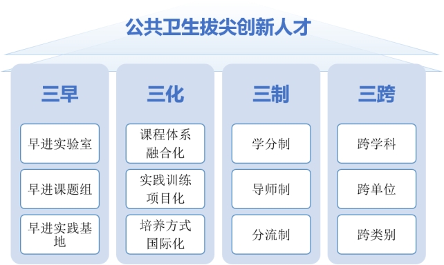 拔尖创新实验班以“三早三化三制三跨”为培养特色,引导学生早进实验室、早进课题组、早进实践基地,注重课程体系融合化、实践训练项目化、培养方式国际化,采取学分制、导师制、分流制,推动跨学科、跨单位、跨类别培养,探索有组织的公共卫生拔尖创新人才自主培养新范式。